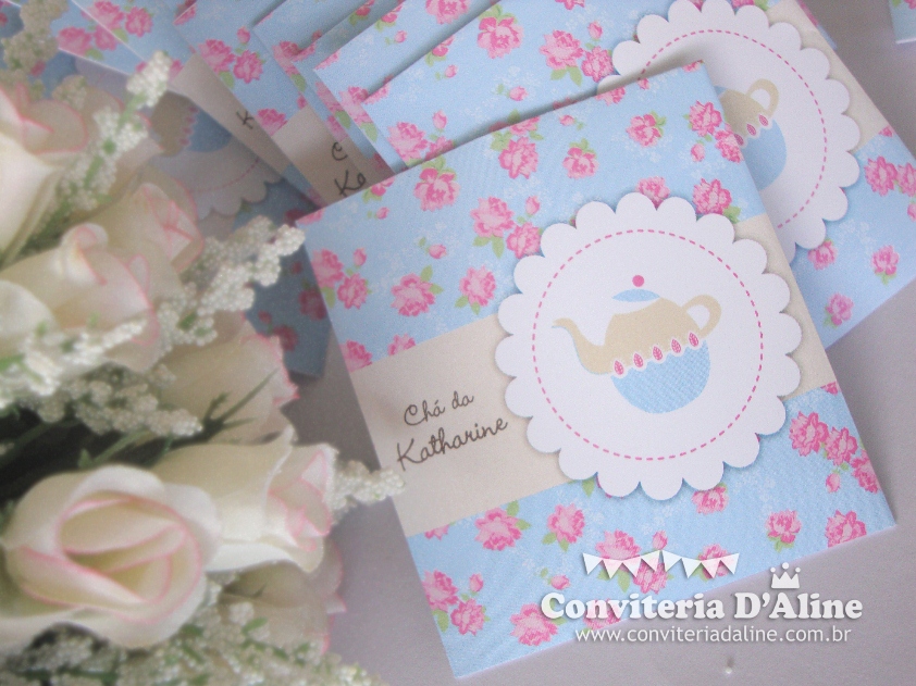 Estes foram os convites em sachês, tags e toppers que enviamos para a Katharine (RJ). Ela adorou o nosso tema para chá de panela na cor azul com rosinhas em estilo provençal e encomendou algumas coisinhas para o seu chá: